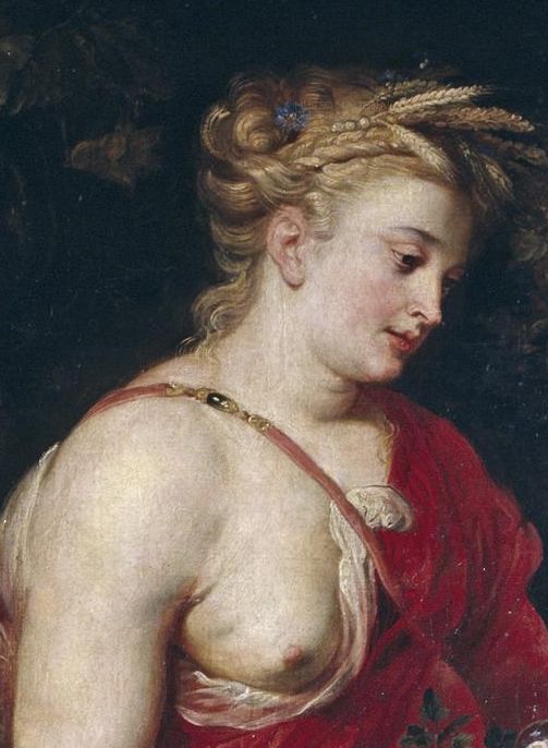 女神ケレスのアトリビュートは穀物、果実や麦の穂の冠、そして鎌。